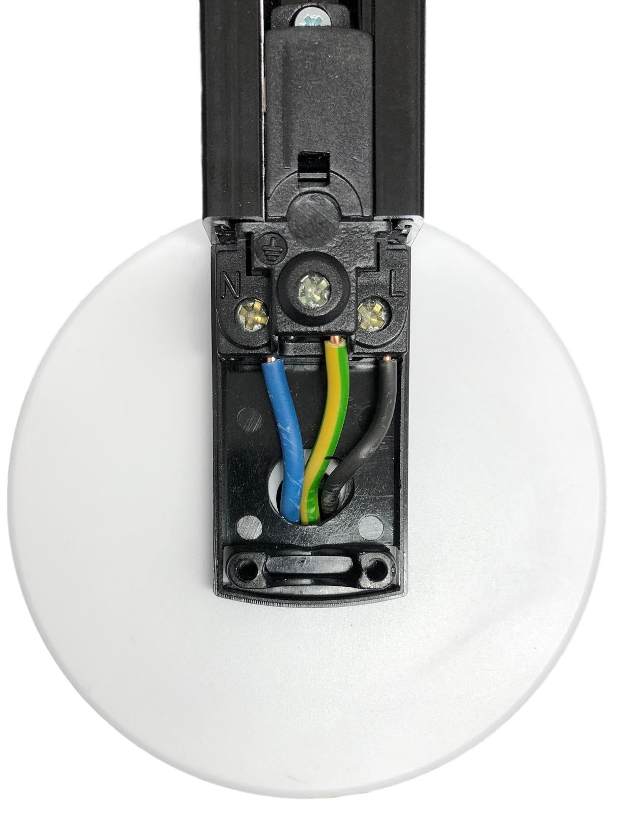 De kabel kan aan de onderkant of achterkant van de eindvoeding ingevoerd worden. Aan de binnenkant van de rail voeding bevinden zich onderstaande aansluitingen welke met een kruiskop schroef eenvoudig aangesloten kunnen worden.