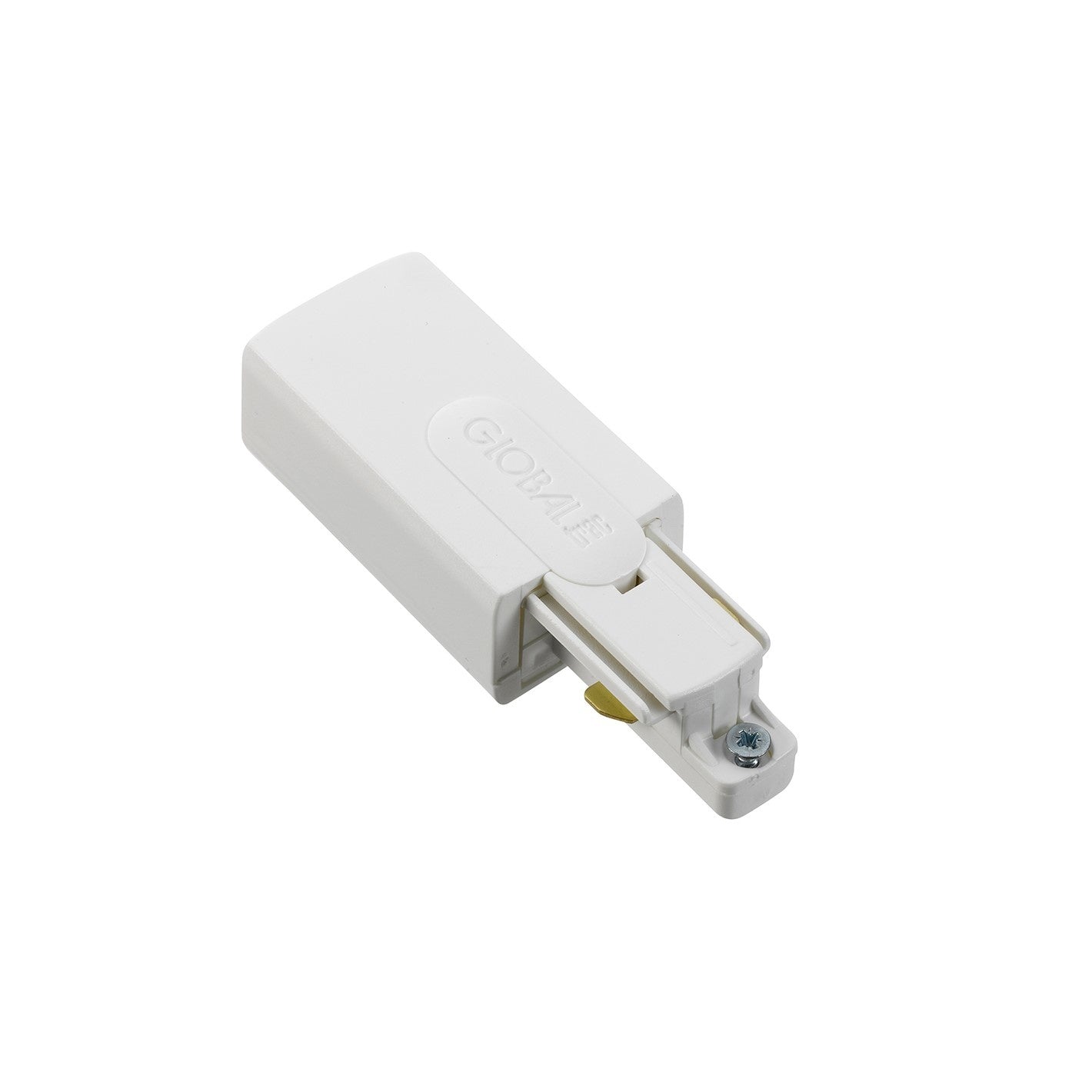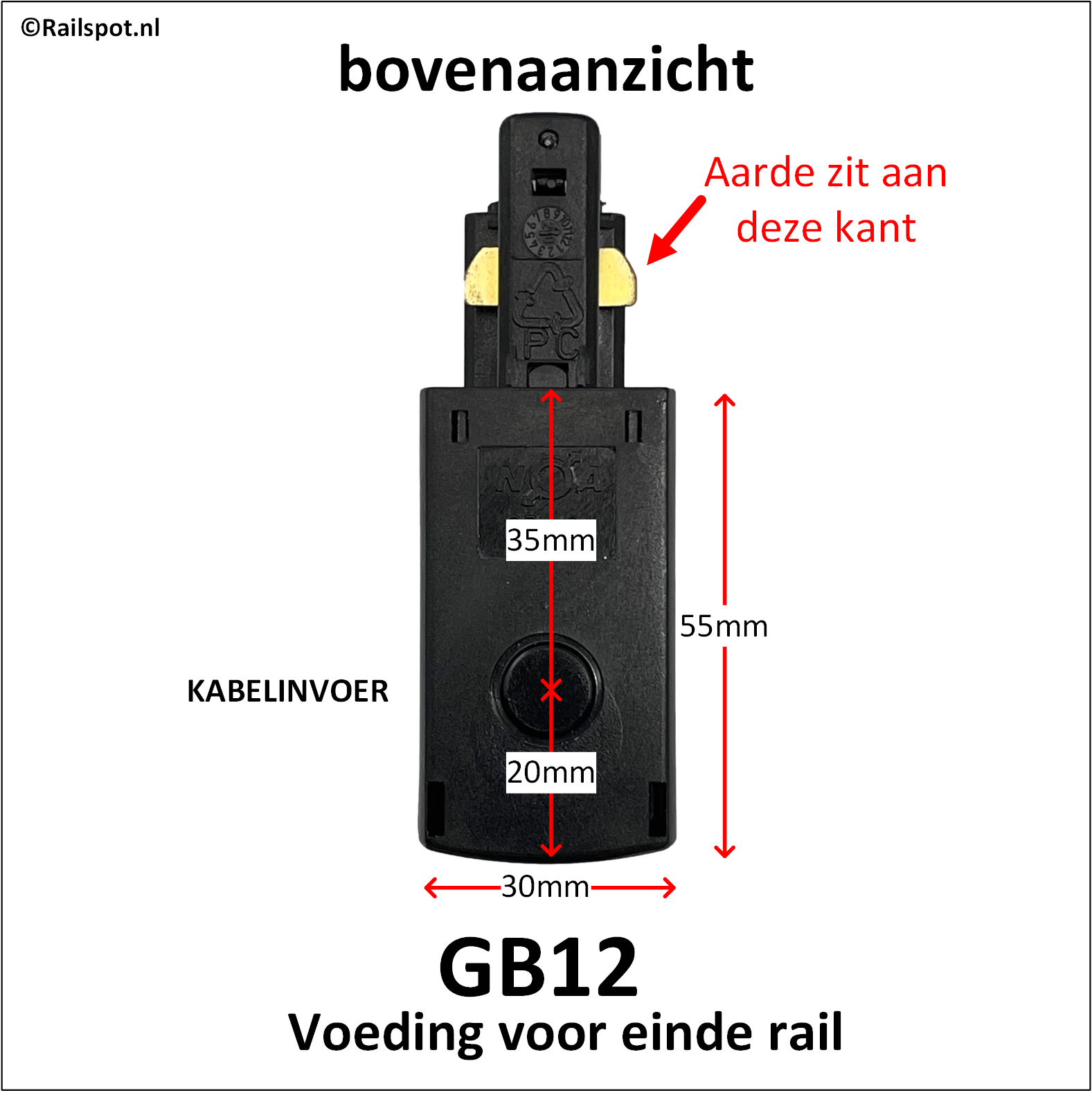 Global Trac Base rail voeding. Wordt gebruikt om spanning (230V) op het uiteinde van de rail aan te sluiten. Leverbaar in twee varianten (GB11 & GB12) afhankelijk van welke kant van de rail de voeding aangesloten moet worden. Zie de foto waarin met de rode lijn de aarde kant wordt aangegeven. Bij gebruik van bijvoorbeeld een hoekstuk moet de rode lijn aan beiden kanten aan dezelfde zijde zitten.