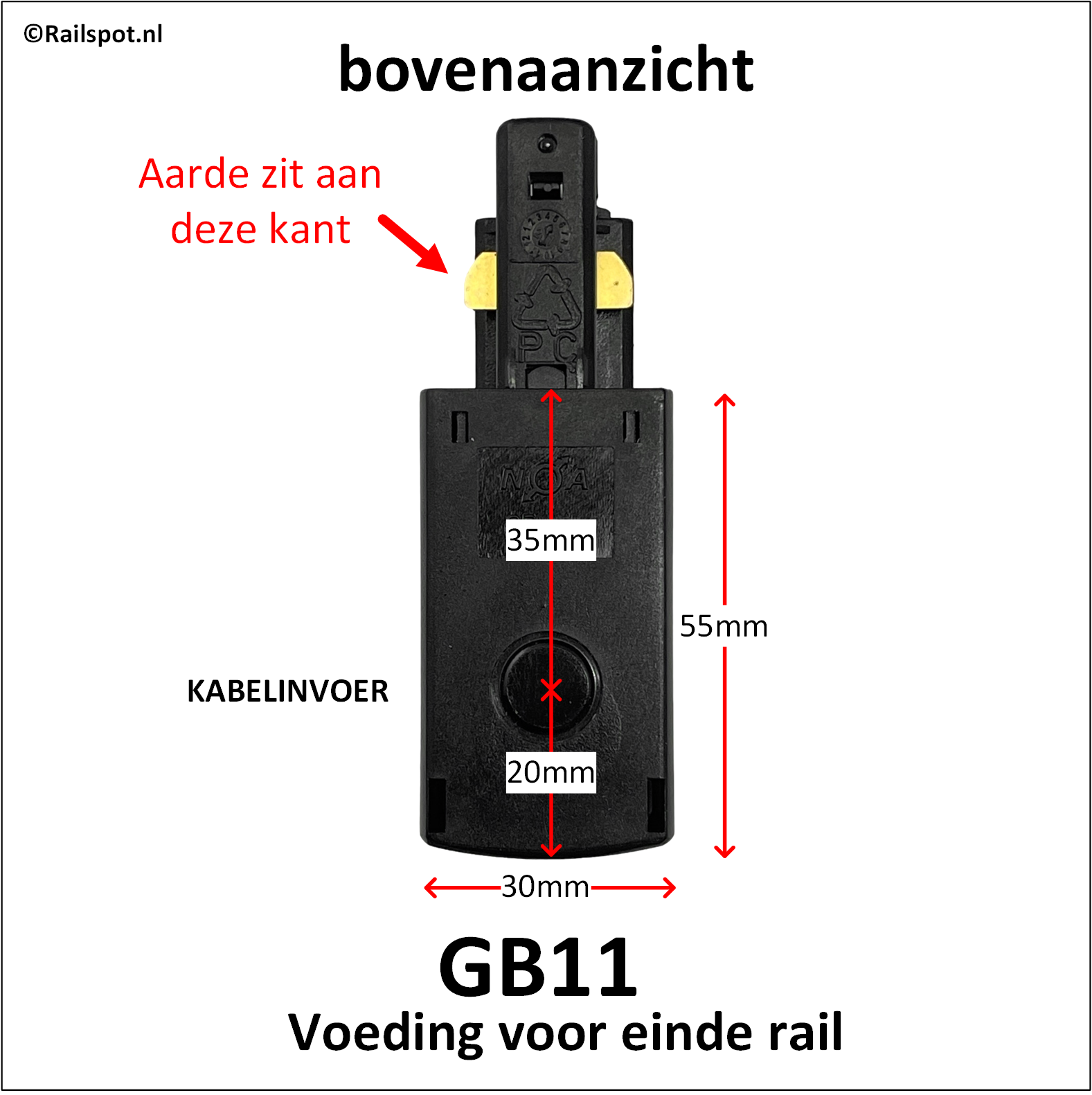 Global Trac Base rail voeding. Wordt gebruikt om spanning (230V) op het uiteinde van de rail aan te sluiten. Leverbaar in twee varianten (GB11 & GB12) afhankelijk van welke kant van de rail de voeding aangesloten moet worden. Zie de foto waarin met de rode lijn de aarde kant wordt aangegeven. Bij gebruik van bijvoorbeeld een hoekstuk moet de rode lijn aan beiden kanten aan dezelfde zijde zitten.