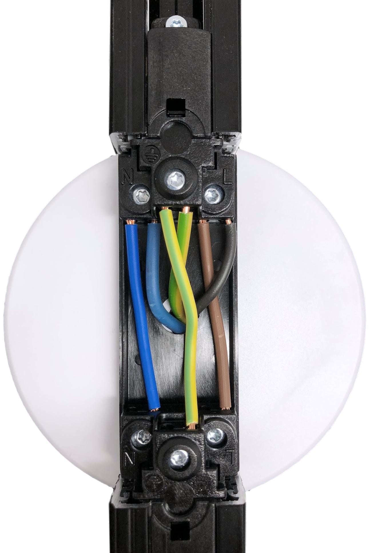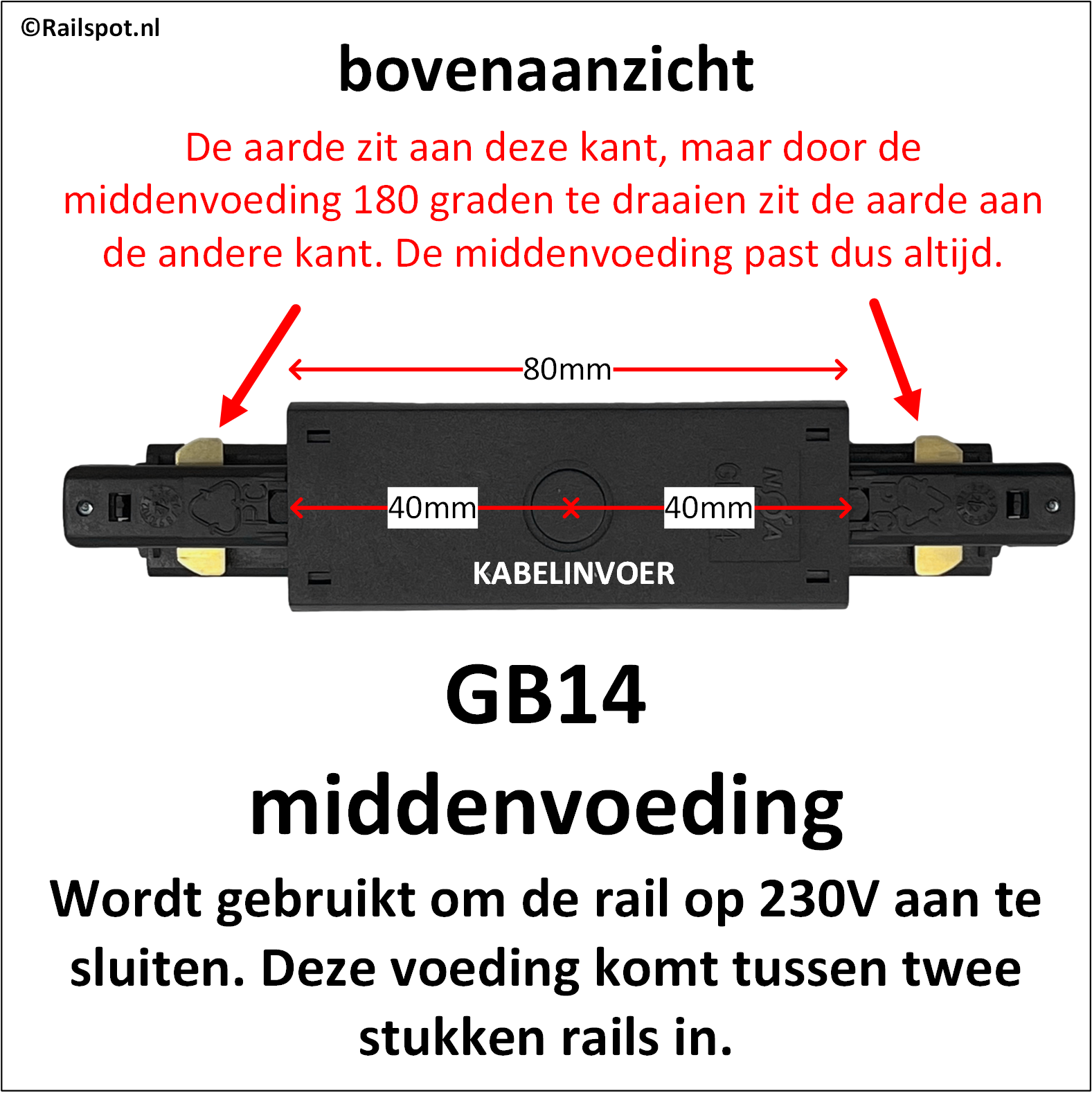 De kabel kan aan de onderkant of zijkant van de middenvoeding ingevoerd worden. Aan de binnenkant van de rail voeding bevinden zich onderstaande aansluitingen welke met een kruiskop schroef eenvoudig aangesloten kunnen worden.