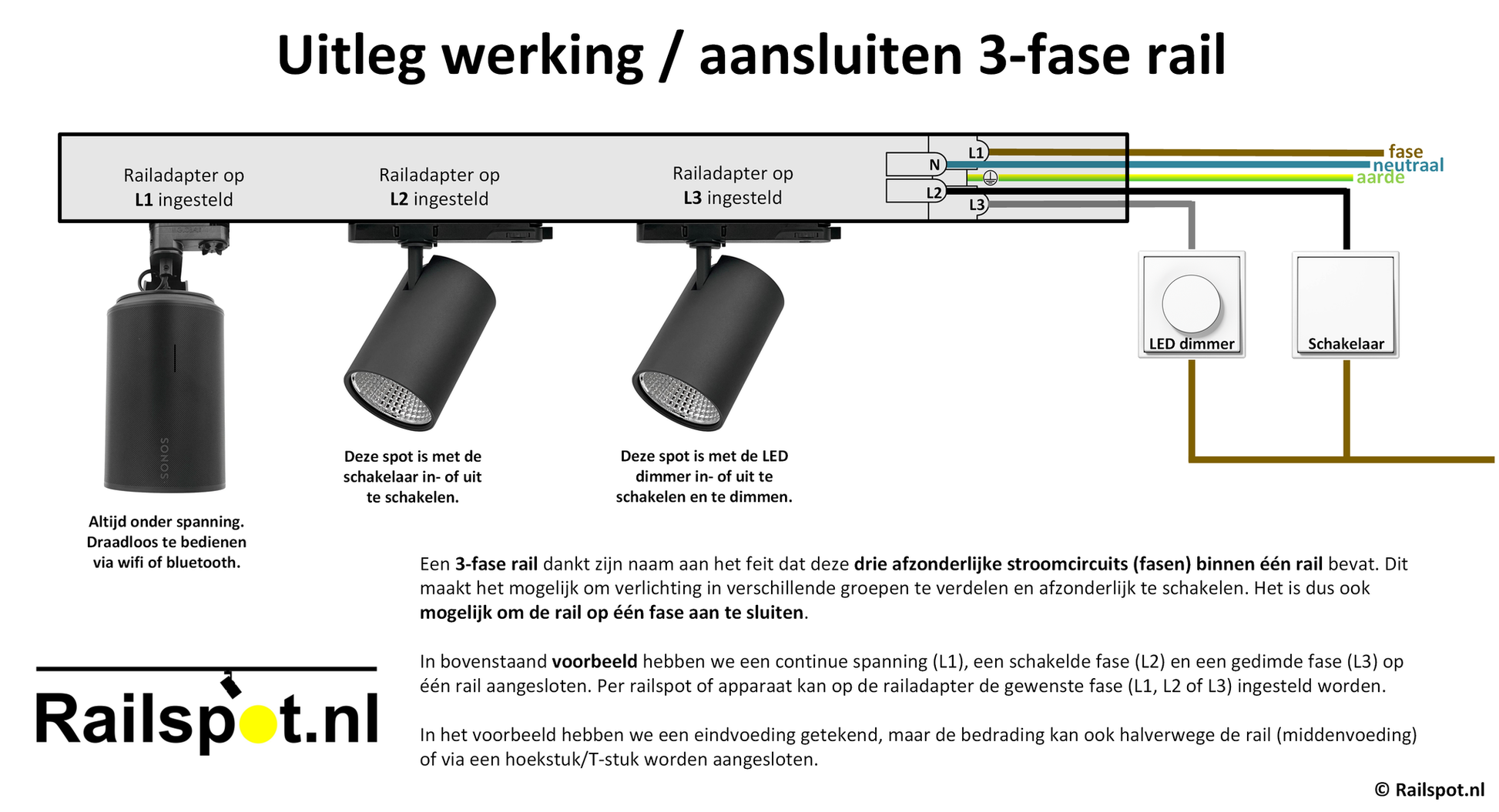 De 3fase rail kan op een normale 230V aansluiting gebruikt worden en kan door de drie afzonderlijke fases bijvoorbeeld door drie afzonderlijke schakelaars bediend worden. De spots kunnen met een draaiwiel op één van deze drie fasen gebruikt worden. In de praktijk wordt vaak maar één fase op de 230V aansluiting aangesloten waarmee alle spots tegelijk aan/uit gaan. Ook kan er bijvoorbeeld een geschakelde voeding en een continue voeding aangesloten worden voor o.a. Philips HUE.