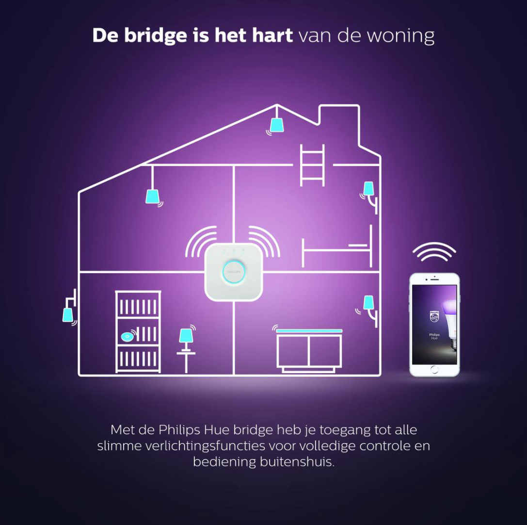 1. De bridge wordt door middel van een netwerkkabel op het thuisnetwerk verbonden. Vaak op het internet modem of netwerk switch. Zorg dus voor een vrije netwerk poort en stroomaansluiting.