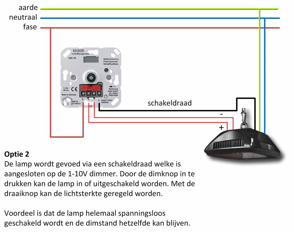 Dit model kan met en zonder dimmer gebruikt worden. Hiervoor is deze voorzien op een 1-10V aansluiting. Indien deze niet gebruikt wordt brand de lamp altijd op volle sterkte.