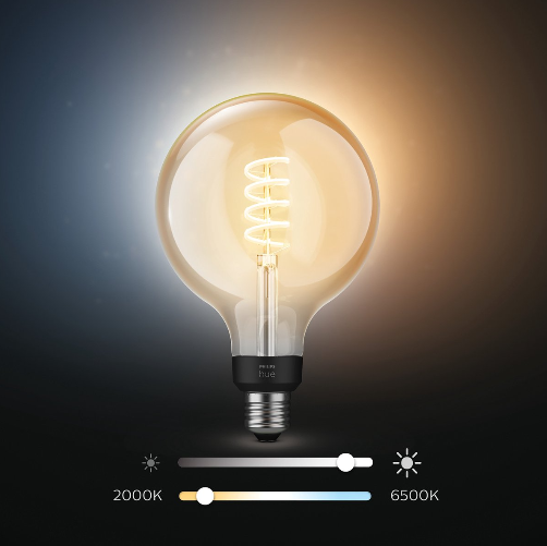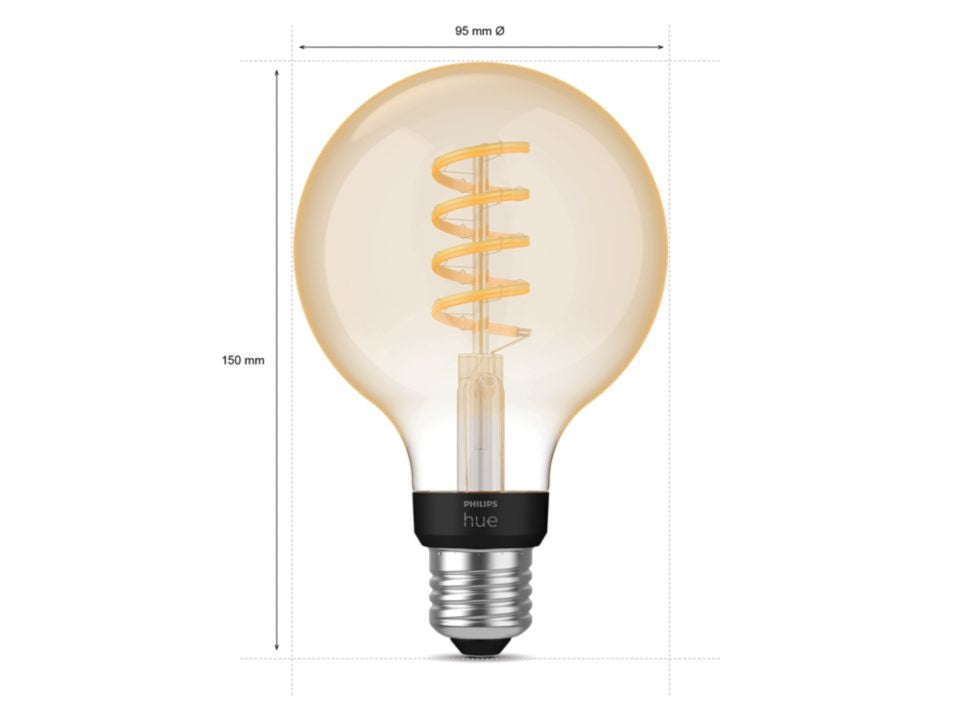 De vintage globevorm (G93) en de 'ouderwetse' spiraalvormige gloeidraad van deze slimme Philips Hue decoratieve LED-lamp met E27-fitting geven een aangename, zachte warmwitte gloed. Je kunt de lamp eenvoudig in- en uitschakelen en dimmen met de Philips Hue Bluetooth app op je smartphone of tablet. Als je meer wilt, maak dan verbinding met een Philips Hue bridge. Die biedt toegang tot nog meer extra verlichtingsfuncties zoals lichtscènes personliseren, timers instellen en nog veel meer. De globelamp laat zich speels combineren met de andere decoratieve Hue-lampen in verschillende vormen.